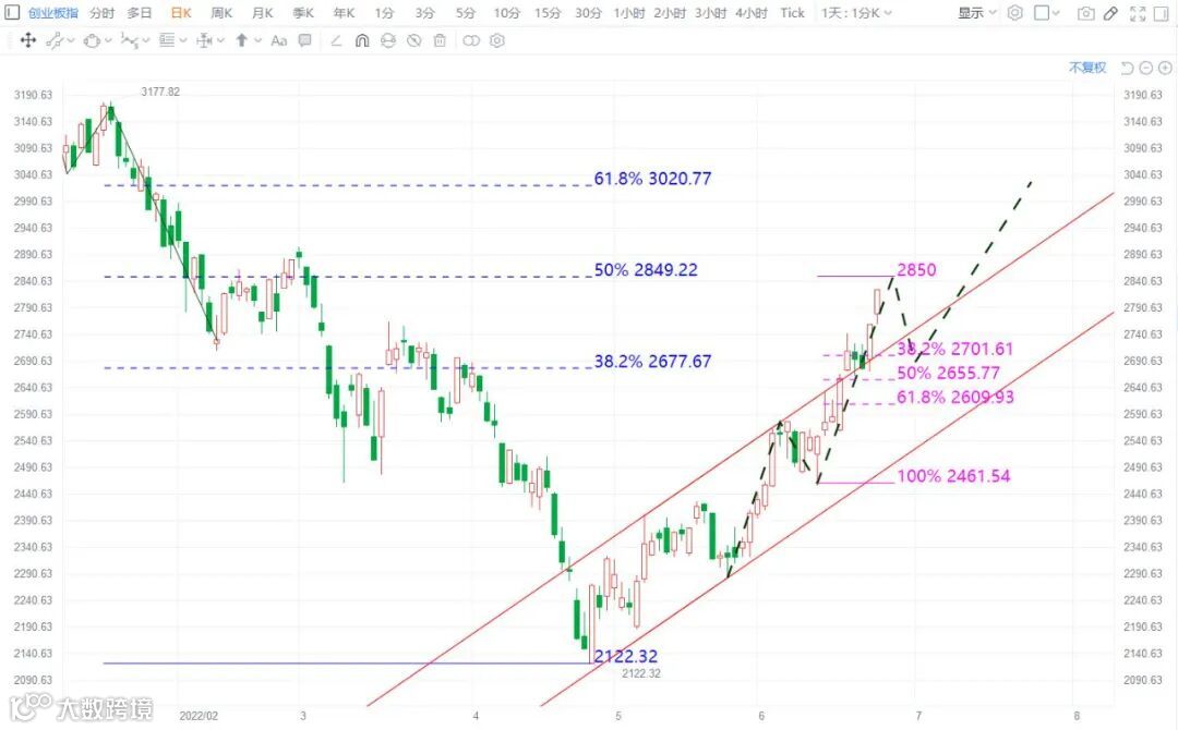 创业板指比上证指数走势强,上周领涨全市场。由于创业板指的反弹还没有到年初初始下跌高点的0.618位置,因此,不排除它还有更乐观的走势。即从周线级别看,创业板指目前还在从2122低点开始的反弹的3浪上涨之中,具体有可能是2283低点是3浪涨点,目前在3-3浪中。按这种最乐观的判断,下周初有一次3-4浪回撤。我们通过回撤的强弱,再来判断后市趋势。这种后市最乐观的划分目前仅限于创业板指数,其他各指数不存在这种划分。下周,我们看最强的指数的走势强弱,看它能否将其它指数带起来。