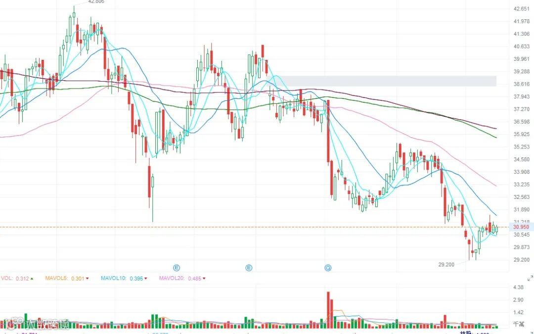 因为业绩下跌,海螺水泥股价下跌至52周新低的29.2元。下半年,水泥行业有望好转,我们慢慢再往下看吧。