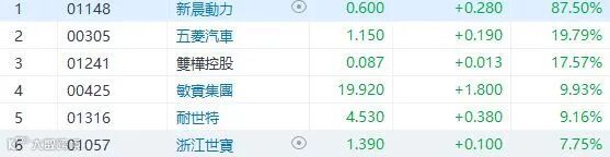 汽车股大反弹,车配股今日炒起,多只车配股大升。其中新晨动力宣布,于4月12日,子公司绵阳新晨、绵阳新晨沈阳分公司及沈阳新晨(合称借款人)订立资产转让委托书,委托沈阳产权交易所处理建议出售抵押资产之抵押资产公开上市过程,条件是中标者须将抵押资产租回予集团作营运用途。新晨动力(1148)爆升87.5%,收市报0.6元。五菱(305)升19.79%,敏实(425)及耐世特(1316)升超过9%,浙江世宝(1057)升7.75%。