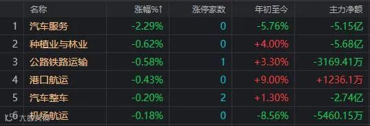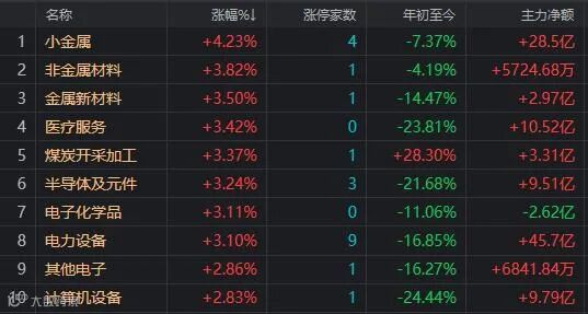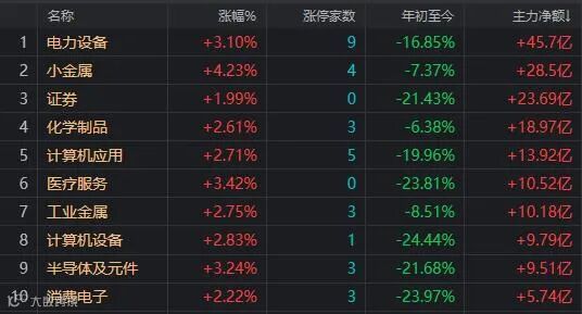 盘面上,盐湖提锂、CRO概念、钠离子电池、汽车芯片等板块涨幅居前,资金流入电力设备、小金属、证券、化学制品等行业板块。只有汽车服务、种植与林业、公路铁路运输、港口航运、汽车整车、机场航运等6个行业板块下跌。