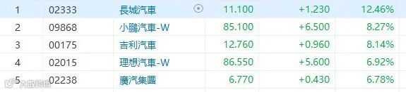 长城汽车在互动平台表示,公司坦克300单月最大产能1.5万台,目前受限于物料供应的问题无法得到充分释放。针对受限的物料,公司正在积极进行扫货并开发新供应商,尽早给消费者交付爱车。公司今年仍将坚持挑战190万台的销量目标。长城(2333)连弹多日,今日升12.46%,收市报11.1元。其他汽车股普涨,小鹏(9868)及吉利(175)升超过8%,理想(2015)升超过6%,蔚来(9866)及比亚迪(1211)都升超过5%。
