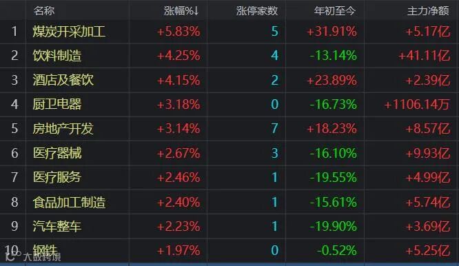 盘面上,煤炭、新冠检测、白酒、地产板块涨幅居前,港口航运、景点旅游、物流板块下跌。
