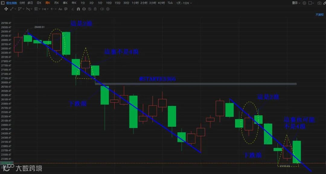 恒指走势完全符合预测,夜期到了23700点附近,可惜的是现货没到。一日弹的弱势,弱得超出预期。因此有了刚才UNITED节目中的假设。(如下图),恒指周K线图从26234高点下来,11月8日那周的反弹与12月6日那周的反弹不是同一级别的反弹。简单地看,好象是5浪下跌,实际上,本周可能不是5浪下跌,而是3-3浪下跌(即五浪下跌中的第三浪里又含有一个5浪)。如果是这样,下周初还在3浪下跌中。不管怎样,主观上,跌势未完,不认爲在本月见到市场的重要底部。