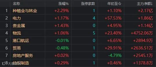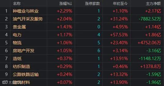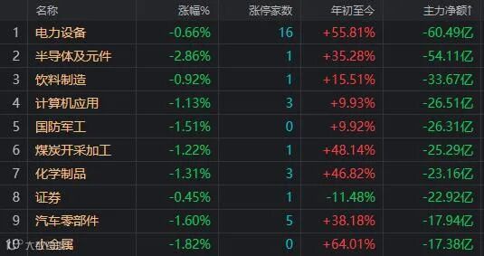 盘面上,只有种植、油气、电力等十一个行业板块,其余行业板块下跌,白酒、光伏、半导体、有机硅、稀土永磁等板块跌幅居前,拖累指数下行。资金净流向方面,实现资金净流入的只有种植、电力、贵金属、物流等九个行业板块,其余板块都是资金净流出,大资金从电力设备、半导体、白酒等板块流出最多。