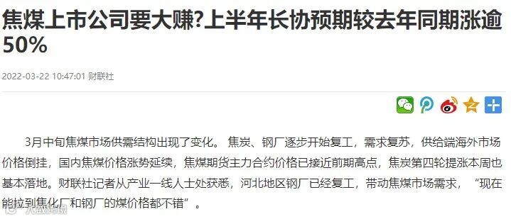 业内普遍预计市场持稳偏强运行,对焦煤价格也形成一定支撑,近期焦炭价格已连续三次提涨。业内人士指出,由于市场供需因素影响,今年一季度焦煤长协价格继续维持高位,与2021年四季度价格基本保持了一致约2200元/吨。