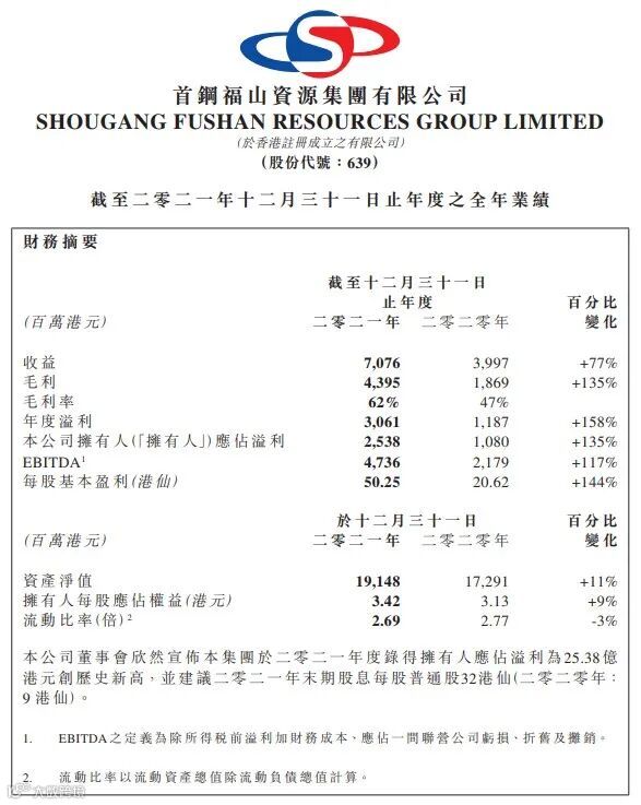 每股基本盈利50.25港仙;建议派发2021年末期股息每股普通股32港仙。如果以星期五收市价2.9元计算,股息高达11厘。首钢资源去年半年已经派息0.08元,全年派息高达13.79厘。