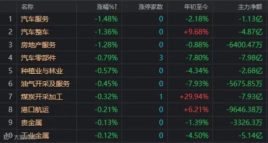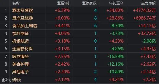 盘面上,汽车服务、汽车整车、汽车零部件、房地产服务、煤炭等少数行业板块下跌。酒店及餐饮、景点及旅游、食品加工制造、饮料制造、机场航运、医疗服务、美容护理等板块涨幅居前。