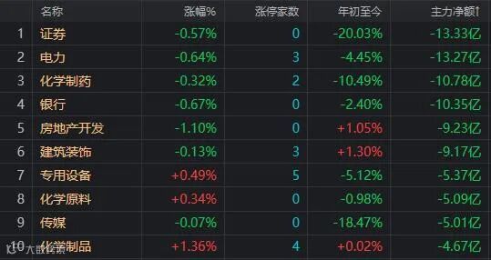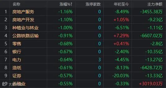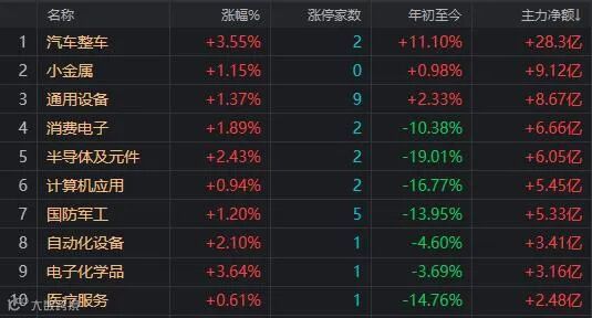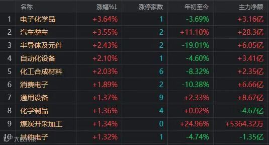 盘面上,电子化学品、汽车整车、半导体及元件、通用设备、国防军工、汽车零部件等行业板块涨幅居前。房地产服务、房地产开发、种植业与林业、大金融等板块在跌幅榜前列。