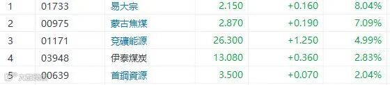 兖矿能源(1171)公布,为进一步优化公司的整体资产结构、提升股东权益价值,支持兖煤澳大利亚(3668)发展,在符合所适用的境内外法律法规和上市监管规定要求的前提下,综合考虑市场情况,在各项先决条件及条件获满足或(如适用)豁免后,公司拟以发行 H 股可转债为对价支付方式,以待公司确定的及法律法规及收购守则允许的收购结构,增持兖煤澳洲股份。兖矿能源升4.99%,收市报26.3元。煤炭普涨,易大宗(1733)升8.04%,蒙古焦煤(975)升7.09%,首钢(639)升2.04%。