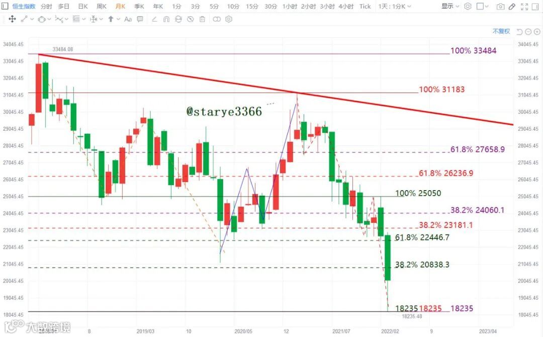 波浪理论有它的格局观,做市场就要有格局,看趋势。大趋势上,恒指大型的ABC调整浪结束,不当作新的开始也要当作大级别反弹开始。所以恒指的反弹是针对31183的大级别反弹,更乐观地,就是针对33484点的反弹。提前说一说,如下图所示的反弹比例,恒指未来反弹的目标位与重要压力位。随着时间的推移,还要注意从33484点与31183点连线的压力,图中红色线所示。