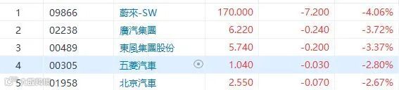 麦格理发布研究报告称,维持长城汽车「跑赢大市」评级,下调今年新能源车及总销量预测34%及13%,但上调新能源车平均售价及综合平均售价预测28%及13%,下调2022/23年净利润预测22%及21%,目标价由34港元调低至19.7港元。长城初段上涨曾升超过4%,收市跌1.16%,报11.94元。其他汽车股徧软,其中蔚来(9866)跌4.06%,广(2238)及东风(489)跌超过3%,吉利(175)及理想(2015)跌超过2%,比亚迪(1211)及长城(2333)跌超过1%。