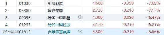 根据克而瑞研究中心提供的数据,今年1-3月份,百强房企在全口径下的整体业绩规模为16279.2亿元,相比去年同期下降了47.1%。而据中国指数研究院提供的数据,今年前3个月,百强房企全口径下销售额均值为162.6亿元,同比下降了47.2%,其中2家房企的销售业绩超过千亿元,较去年同期减少了3家。内房股下跌,龙光(3380)跌7.17%,合景泰富(1813)及远洋(3377)都跌超过5%,雅居乐(3383)及绿城(3900)也跌超过4%。