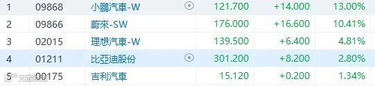 中金公司认为,新能源车销量恢复增长,全球有望迎共振复甦。随着上海疫情5月逐步控制、复工复产稳步推进,供需来自疫情的影响边际减弱,全球新能源车进入复甦通道。在政策加持、新车型产品力驱动、以及供给弹性释放背景下,我们基于中性预测,预计2022年全球新能源车销量约943.1万辆,同比增长41.8%。汽车股造好,新势力表现仍然较强,小鹏(9868)升13%,蔚来(9866)升10.41%,理想(2015)升4.81%,比亚迪(1211)升2.8%,吉利(175)升1.34%。