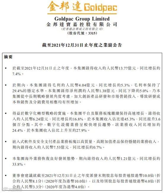 金邦达宝嘉公布去年业绩,收入13.77亿元,同比增长7.4%,录得净利润1.38亿元,同比下跌5%,建议派发2021年末期股息每股10港仙以及特别股息每股4港仙。数字化转型是全球性的机遇和风口,也是金融科技产品和服务的发展方向。金邦达宝嘉打造数字化业务生态,是安全支付龙头。