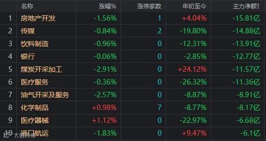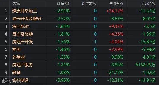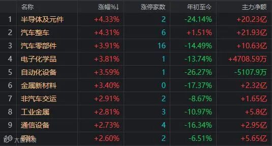 盘面上,汽车整车、半导体及元件、汽车零部件、通信设备、国防军工等板块涨幅居前,煤炭开采加工、油气开采及服务、港口航运、景点旅游、房地产等板块下跌。