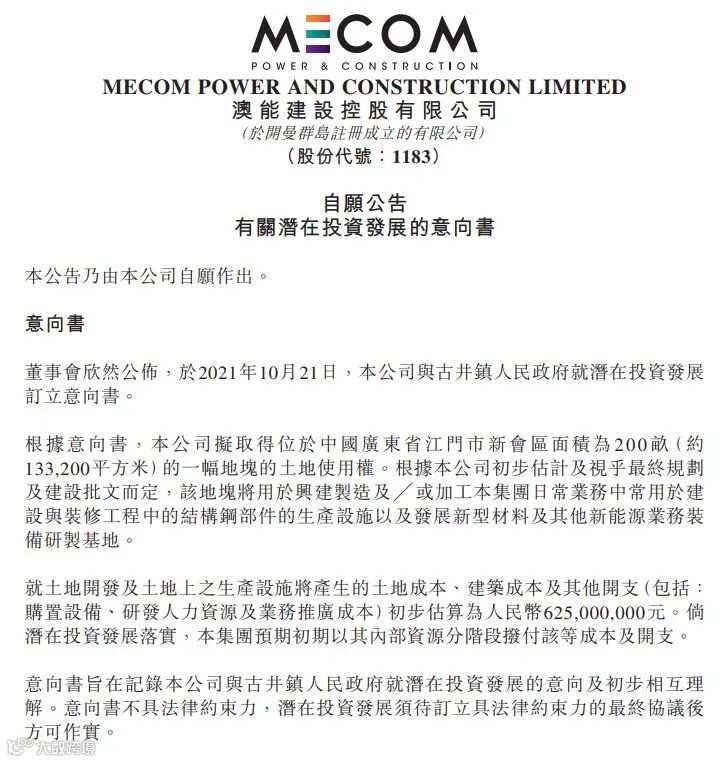 恍然大悟!2021年10月21日,澳能建设与古井镇人民政府就潜在投资发展订立意向书。根据意向书,公司拟取得位于广东省江门市新会区面积为200亩(约13.32万平方米)的一幅地块的土地使用权。该地块将用于兴建制造及╱或加工集团日常业务中常用于建设与装修工程中的结构钢部件的生产设施以及发展新型材料及其他新能源业务装备研制基地。