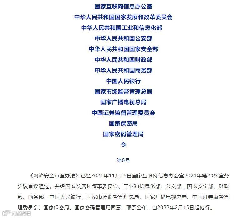 国家网信办和发改委等13个部门联合修订发布《网络安全审查办法》,并将于2022年2月15日开始实施。