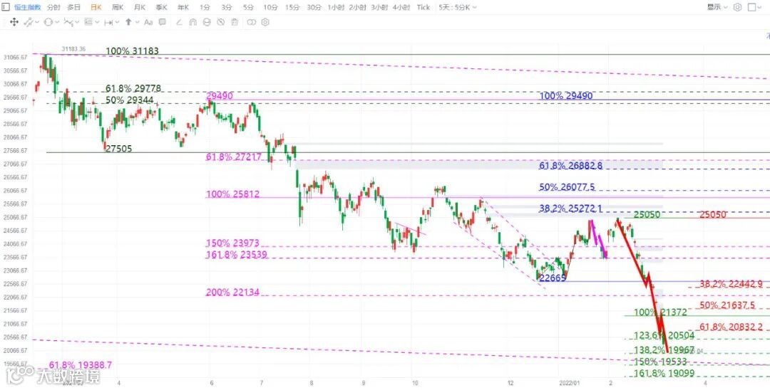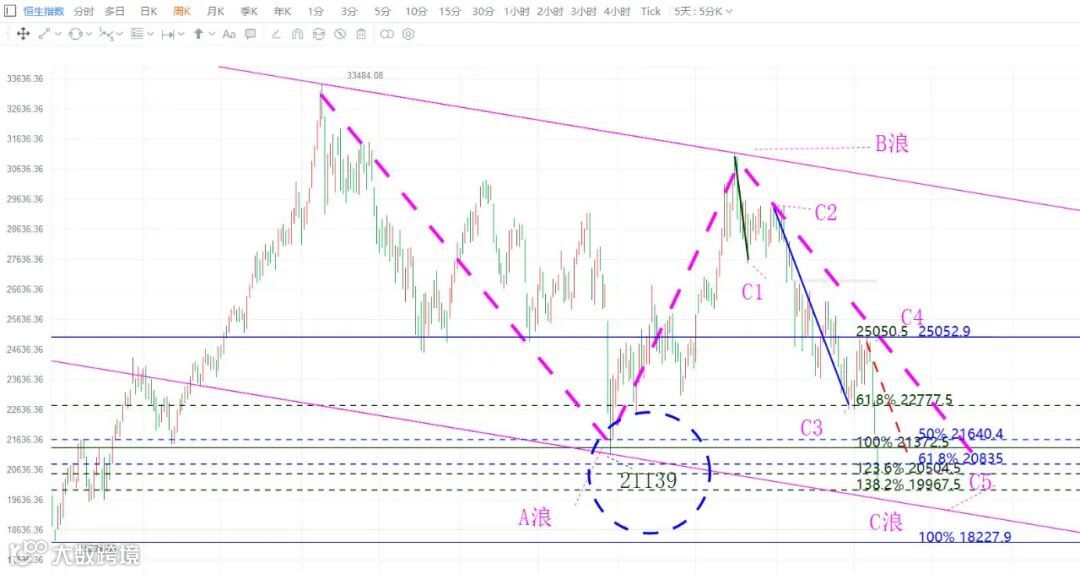 二是结合黄金比例关系的运用。恒指20800点是C-3浪的0.618倍的目标位,跌破之后,就转变成看20504、19967等C-1浪下跌的倍数。图中绿色线显示。