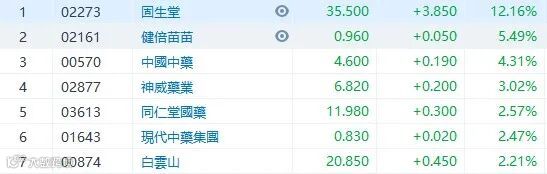民生证券指出,中医在健康管理方面具备独特优势,可满足我国急需的慢病管理需求。民营中医连锁化大势所趋,并带动上游高质量发展,建议关注连锁中医连锁服务固生堂。半新股的固生堂今日领涨中药股,升12.16%,收市报35.5元。中国中药(570)升4.31%,同仁堂(3613)、现代中药及白云山(874)都升超过2%。