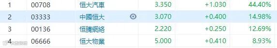 中国恒大在港交所公告,全资子公司向沈阳盛京金控投资集团有限公司出售盛京银行17.5亿股的非流通内资股,占盛京银行已发行股份的19.93%;对价为每股人民币5.7元,合计人民币99.93亿元。恒大(3333)今日升14.98%,收市报3.07元。恒大系全涨,其中恒大汽车暴涨44.4%,恒腾(136)升12.69%,恒大物业(6666)升8.93%。