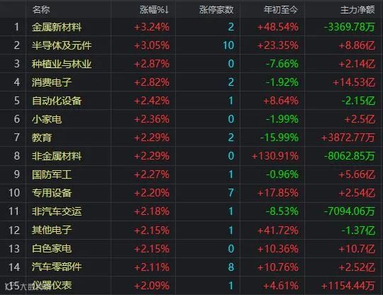 盘面上,只有少数行业板块下跌,半导体及元件、新能源汽车、光伏等多板块持续活跃涨幅居前,元宇宙、北交所概念全天上涨,汽车整车、CRO概念走弱,机场航运跌幅居前。