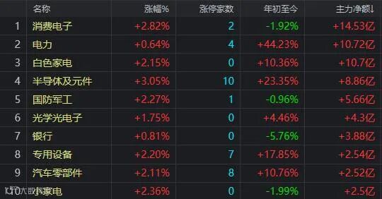 资金净流入前十的板块: