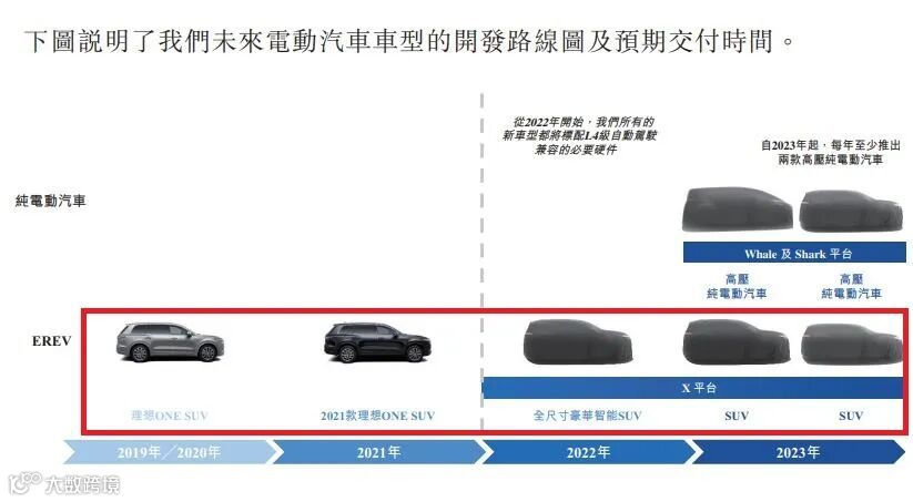 理想跟其他的造车新势力不同的是理想现时只生产增程序电动车,未来会新加高压纯电的新路线。按照其战略规划,理想纯电动产品预期交付时间是2023年,即是在未来两年里,理想ONE,明年的理想X01都是增程序电动车。