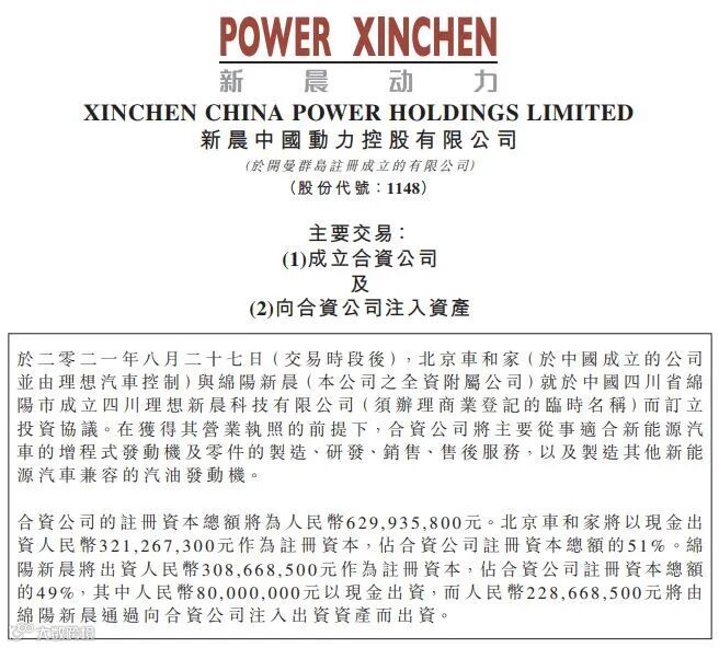 合资公司的注册资本总额将为人民币6.30亿元,理想占51%,新晨占49%。资金主要包括与CE装配线及缸体机加线有关的设备、机器及在建工程,且其账面总值及评估价值分别为约人民币2.41亿元及人民币2.14亿元。