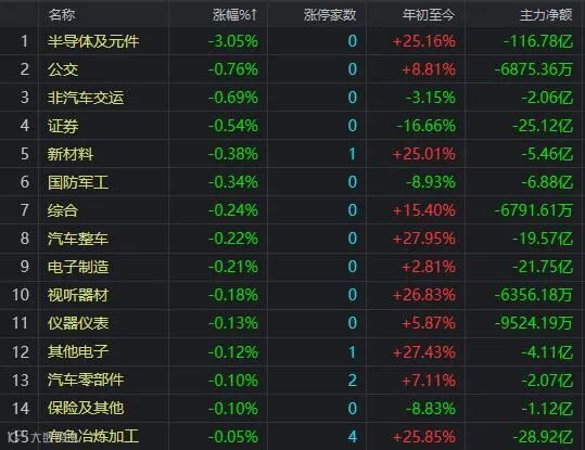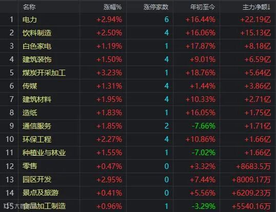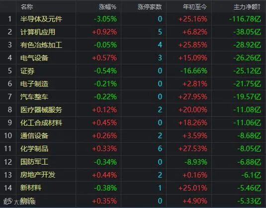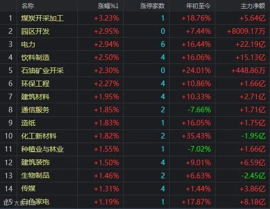盘面上行业板块涨多跌少,煤炭、园区开发、电力、饮料制造、石油矿业、环保工程等板块位居涨幅榜前;半导体及元件板块跌幅最大,证券和国防军工板块也在跌幅榜前。光伏建筑一体化、有机硅、碳中和、煤炭、网络游戏等概念涨幅居前;国家大基金持股、第三代半导体、钛白粉、鸿蒙概念等跌幅居前。资金净流入超过5亿元的板块有电力、饮料制造、白色家电、建筑装饰、煤炭等;资金净流出大于20亿元的有半导体、计算机、有色、电气设备、证券等行业板块。