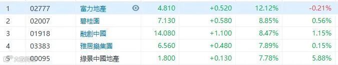 富力地产发布公告,李思廉及张力(统称“主要股东”)各为该公司的执行董事及大股东,已与该集团沟通,彼等为支持该集团将提供约80亿港元的股东资金,并预计于未来一至两个月内完成。该公司预期于2021年9月21日收到约24亿港元。碧桂园服务以不超过人民币100亿元的代价收购富良环球,由此间接收购富良环球所持的各目标公司100%股权。富力地产(2777)升12.12%,收市报4.81元。其他内房股普好,其中碧桂园(2007)及融创(1918)升超过8%。雅居乐(1918)也升7.89%。