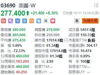 10 月8 日,市场监管总局依法对美团在中国境内网络餐饮外卖平台服务市场实施“二选一”垄断行为作出行政处罚,责令美团停止违法行为,全额退还独家合作保证金12.89 亿元,并处以其2020 年中国境内销售额1147.48 亿元3%的罚款,计34.42 亿元。反垄断处罚落地,罚款也比市场预期的低,美团(3690)升8.36%,收市报277.4元。