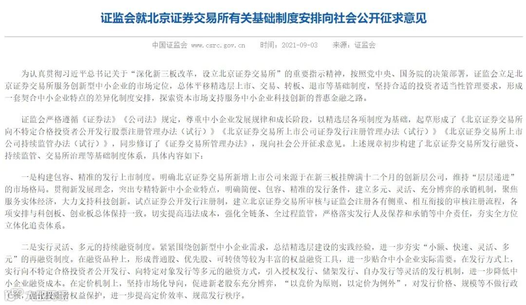 证监会在提及设立北交所有三个目标,目标之一是培育一批专精特新中小企业,形成创新创业热情高涨、合格投资者踊跃参与、中介机构归位尽责的良性市场生态。