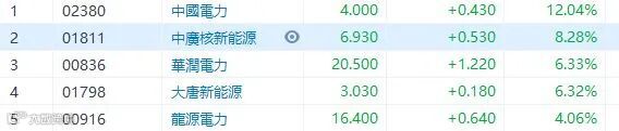 安信证券指出,现货交易对新能源消纳至关重要。现货交易相比于电力中长期交易电价波动幅度更大,建立现货交易市场可以真正地推动电力需求侧响应, 即用户将根据电价情况调整用电计划,起到从需求端实现削峯填谷的作用。绿电股普涨,中国电力(2380)升12.04%,中广核新能源(1811)升8.28%,华润电力(836)及大唐新能源(1798)都升超过6%。