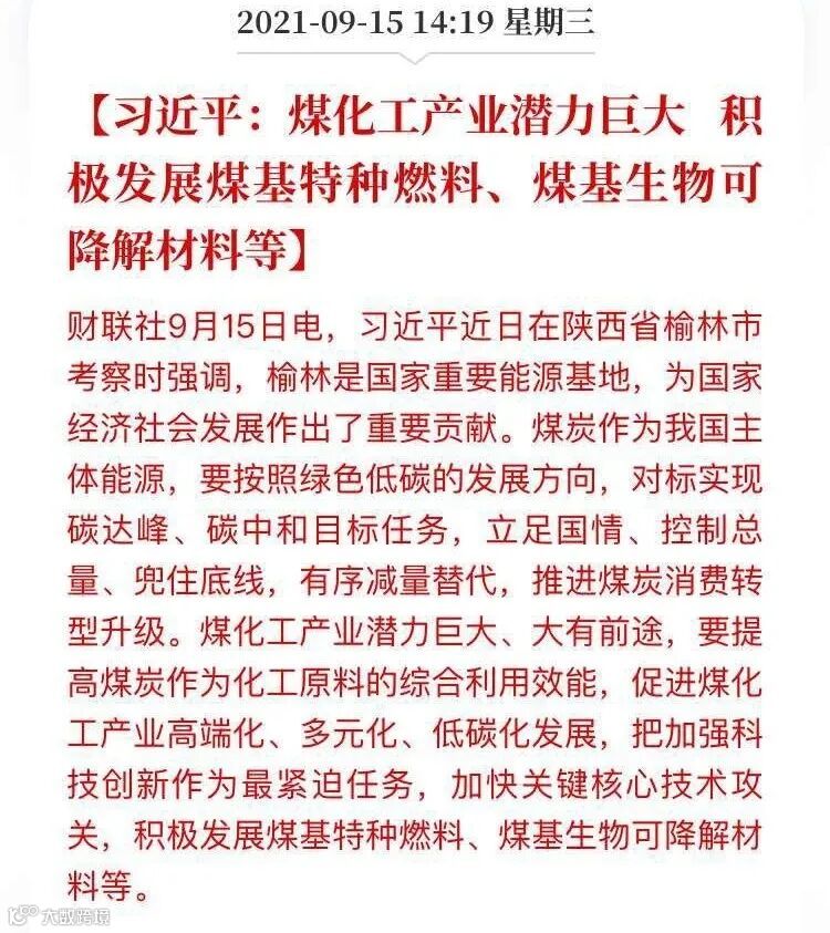 在碳中和的前提下,煤被认为迟早要减少使用的能源,但最近煤炭价格高企,早前还传出来出现供需危机。为什么煤炭又被人记起来呢?今日,领导人到了榆林考察,强调煤炭作为我国主体能源,要按照绿色低碳的发展方向,推进煤炭消费转型升级。煤除了传统燃媒发电、炼钢之外,还有什么用途呢?煤股中又有什么好的选择?