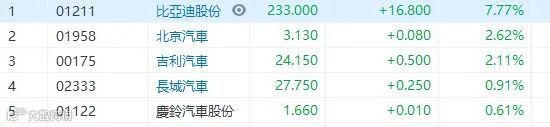 汇丰研究发研报指,新能源车增长继续跑赢大市,上调2021-22年新能源车销量预测13%,其中比亚迪股份乘用车于5月份销量同比增长54%并跑赢内地汽车市场的38%增长表现,预计新能源车的增长动力会更强,因受强劲产品周期带动,维持“买入”评级,目标价由340港元升至350港元。比亚迪(1211)升7.77%,收市报233元。其他车股中,北京汽车(1958)升2.62%,吉利(175)也升2.11%。