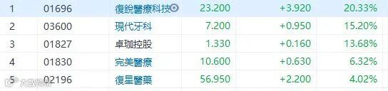 复鋭医疗科技近日发布上半年盈喜,期内营业收入同比增长超过73%,预计8.15 亿元人民币以上;净利润同比增长超过190%,预计绝对值1.03亿元人民币以上。复鋭医疗(1696)升20.33%,收市报23.2元。其他医美概念股也炒起,其中现代牙医(3600)升15.2%,完美医疗(1830)也升6.32%。