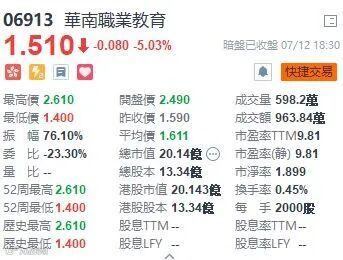 华南职业教育获6.01倍认购,分配至公开发售的发售股份最终数目为3340万股,占发售股份总数的10%。一手中签率20%,认购10手稳中一手,每股定价1.59港元,每手2000股。华南职业教育(6913)富途暗盘价微跌5.03%,报1.51元,每手不计手续费赚160元。