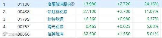 华创证券表示,上周行业内共有39家玻璃企业发函上调产品价格,涨幅为1-3元/重箱不等,且多家企业表示后续仍有调涨计划。企业集体调价带动玻璃市价提升,根据卓创数据,截至7月11日,国内重点城市浮法玻璃现货平均价2888.74元/吨,环比上涨0.62%,价格继续上涨,整体产销良好。光伏玻璃股集体爆发,其中洛阳玻璃(1108)升24.16%,收市报13.98元。彩虹新能源(438)升11.07%,信义玻璃(868)也升5.01%。