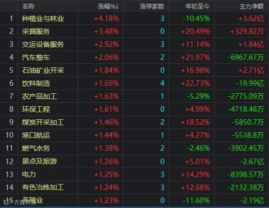 盘面上,种植业与林业涨幅居前,采掘服务、汽车整车、石油矿业、煤炭、港口航运等板块活跃做多,计算机、半导体、钢铁、证券等板块下跌。概念板块方面,鸿蒙概念、云办公、数字货币、国产软件等板块回调盘整。板块多数上涨,快速输动,稀土永磁板块午后持续拉升,五矿稀土、东方锆业等涨停,盛和资源、北方稀土、章源钨业跟涨;汽车整车板块午后异动拉升,江淮汽车涨停,广汽集团、福田汽车、上汽集团、北汽蓝谷等跟涨;饮料制造板块午后拉升,承德露露此前涨停,均瑶健康、古越龙山、莫高股份跟涨;碳中和板块短线拉升,福建金森涨停,云天化、冠中生态、华民股份跟涨。