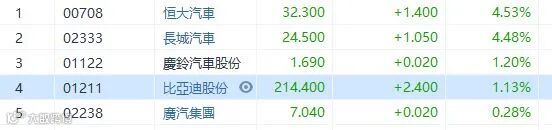 中国汽车工业协会发布了2021年5月汽车工业经济运行情况。数据显示,5月份,汽车产销为204.0万辆和212.8万辆,环比下降8.7%和5.5%,同比下降6.8%和3.1%。今年1-5月,汽车累计产销1062.6万辆和1087.5万辆,同比增长36.4%和36.6%。汽车股造好,其中比亚迪(1211)升1.13%,收市报214.4元。恒大汽车(708)及长城汽车(2333)升超过4%。
