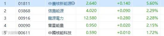 摩根士丹利发表研究报告,指中广核新能源是内地“碳中和”概念及电力需求上升的最佳电力股投资对象,今年首五个月风电产量按年升71%,胜该行预期,增幅亦远高于同业。该行料增长势头未来数个月持续,上调今年至2023年每股盈测分别7%、10%及11%,亦反映南韩项目表现改善,目标价升14%,由2.5港元上调至2.85港元,评级“增持”。中广核新能源(1811)升5.6%,收市报2.64元。其他再生能源发电股也造好,其中信义能源(3868)及龙源电力也升超过2%。