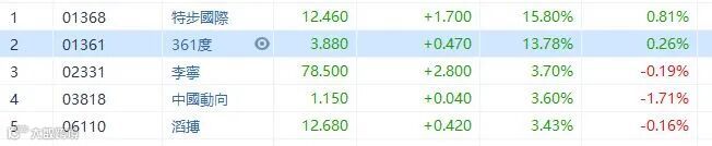 瑞信发研报将特步国际目标价从3.9港元大幅上调238%至13.2港元,评级由“中性”升至“跑赢大市”,并上调公司2021/2022年每股收益8%及11%,称看好品牌势头强劲、产品组合一令均价增加。特步国际(01368)升15.8%,收市报12.46元。其他体育用品股也普涨,其中361度(1361)升13.78%,李宁(2331)也升3.7%。