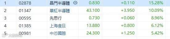 彭博援引知情人士透露,国务院副总理刘鹤已被委以一项新的重任——领导第三代半导体的研发和制造项目,包括拟定一系列相关金融和政策扶持措施。半导体股出现普涨,其中晶门半导体(2878)升15.28%,华虹半导体(1347)升10.09%,中芯(981)也升5.42%。
