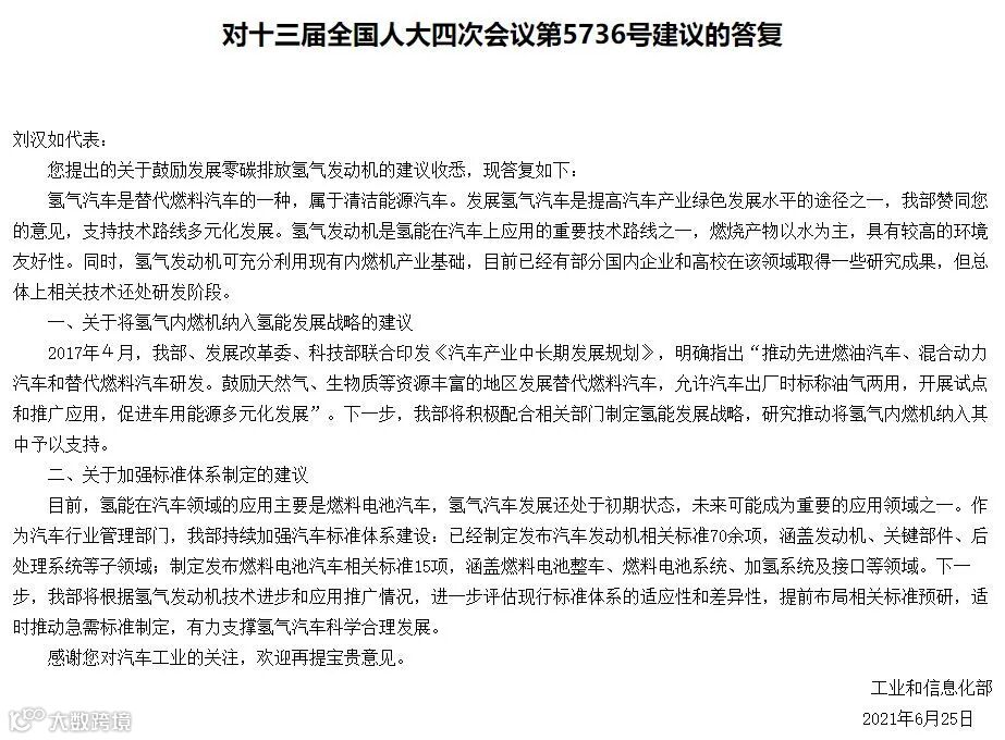 不久前,工信部公布《对十三届全国人大四次会议第5736号建议的答复》,对「关于鼓励发展零碳排放氢气发动机的建议」表示赞同,表示支持技术路线多元化发展。