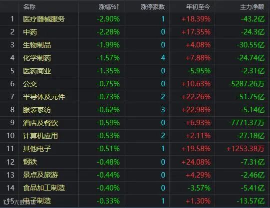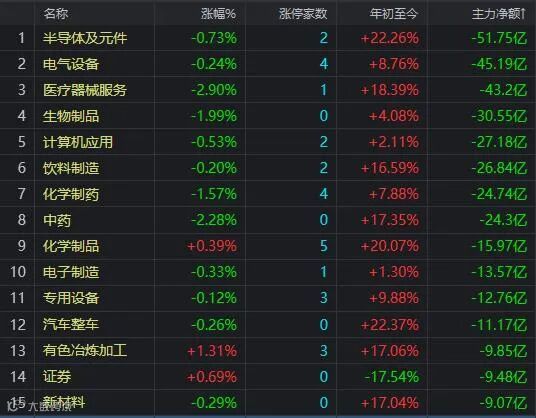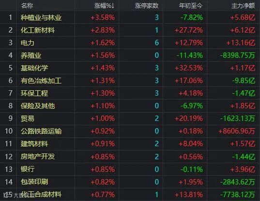盘面上,种植业与林业、化工新材料、电力、养殖业、有色等行业板块涨幅居前;转基因、氟化工、鸿蒙概念等板块活跃;医疗器械、网约车、眼科医疗、国家大基金持股等概念板块跌幅居前;主力资金净流入次新股、风电、柔性屏、农业碳中和等概念板块;资金净流入前5名的行业板块分别爲电力、光学电子、化工新材料、种植与林业、银行保险板块;资金从半导体及元件、电气设备、医疗器械、生物制品、计算机等行业板块流出;从新能源车概念、锂电池概念、芯片概念、医疗器械概念、医美概念等热门板块流出。