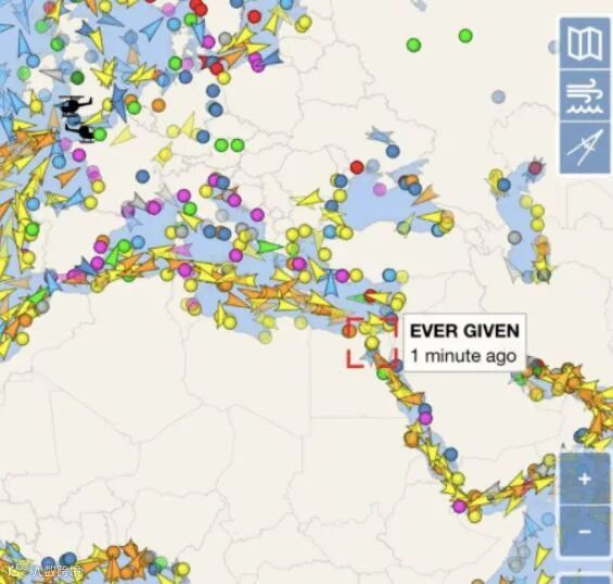 一艘由长荣海运营运的大型货柜轮在通过苏伊士运河(Suez Canal)时,竟在狭窄的航道上转弯时搁浅,船只整个横向卡在运河当中,造成运河整个堵塞,从船只追踪网站上显示,地中海、红海入口处布满等待通过运河船只,仍不知何时可以通行,也使这条重要的国际贸易航道受阻,让目前货柜、航班吃紧的海运市场更加紧张。