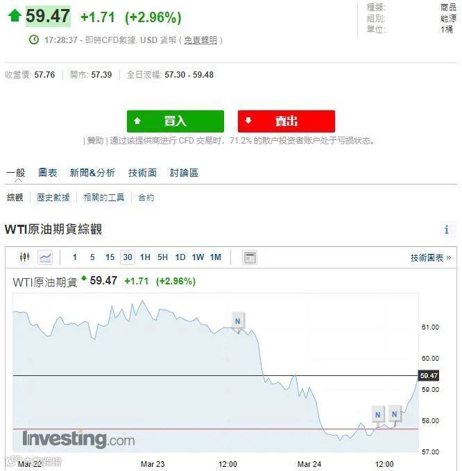 WTI原油期货短时间急升,小编落笔时已经已至59.47美元,升幅接近3%。投资人显然正评估苏伊士运河通行受阻所带来影响,苏伊士运河运输受阻所造成影响可能只会是暂时性的。