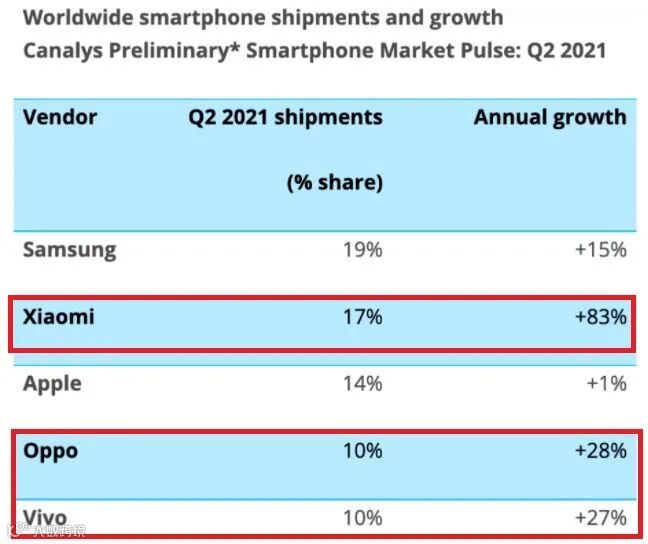 星期五,Canalys发布了第二季度全球智能手机市占率排名,小米手机销量超越了苹果,首次晋升全球第二,三星排名第一位,OPPO和Vivo分别为第三第四位,数据显示,小米全球智能手机市占率达到 17%,同比增长83%。OPPO及VIVO也分别增长了28%及27%。