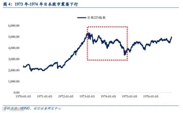 1973年初到1974年底快两年的时间内,美股大跌四成,这段时间SP500的P/E也大幅下降,从18到8附近,虽然EPS仍然保持增长,但是受通胀和实际利润率影响,市场整体估值处于历史低位。日本股市也同样一直震荡下跌,同样跌足两年。