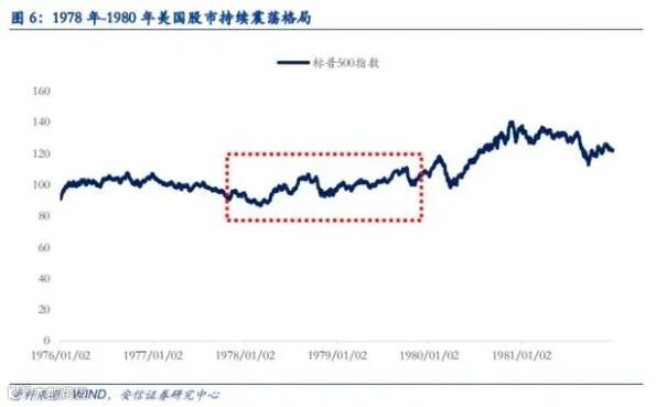 由于70年代初期利率的大幅上行,美股的估值水平已经跌至相当低水平。因此70年代后期,股市下杀的空间已经有限。同时,通胀推升EPS抵消了估值下跌,最终美股横行格局。